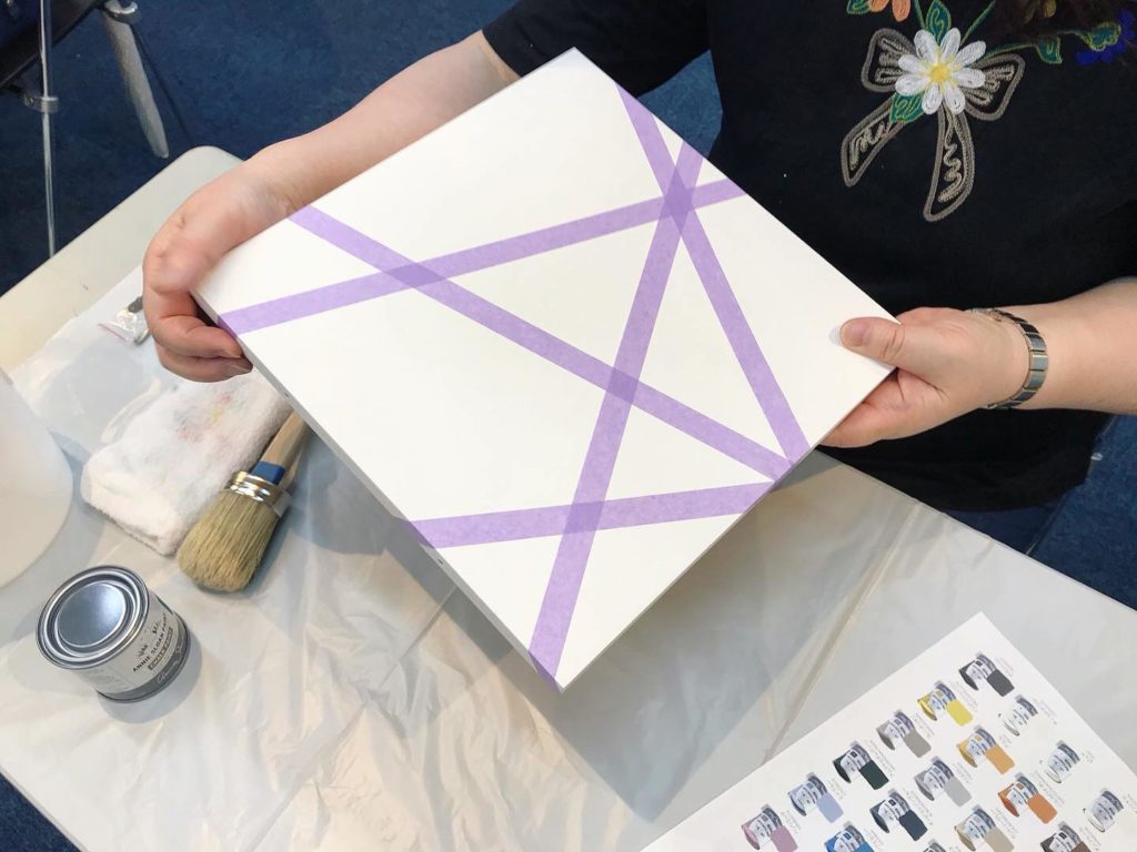 今回のワークショップの最重要ポイント!白地に塗られたパネルにマスキングテープで線を付けていきます。貼る場所は色を塗らない部分になるので、しっかりと、側面もカバーしていきます。マスキングテープは何度も貼って剥がせるのが良いところ!とりあえず張って剥がしてと、何度が試して悩みながら決めました♪
