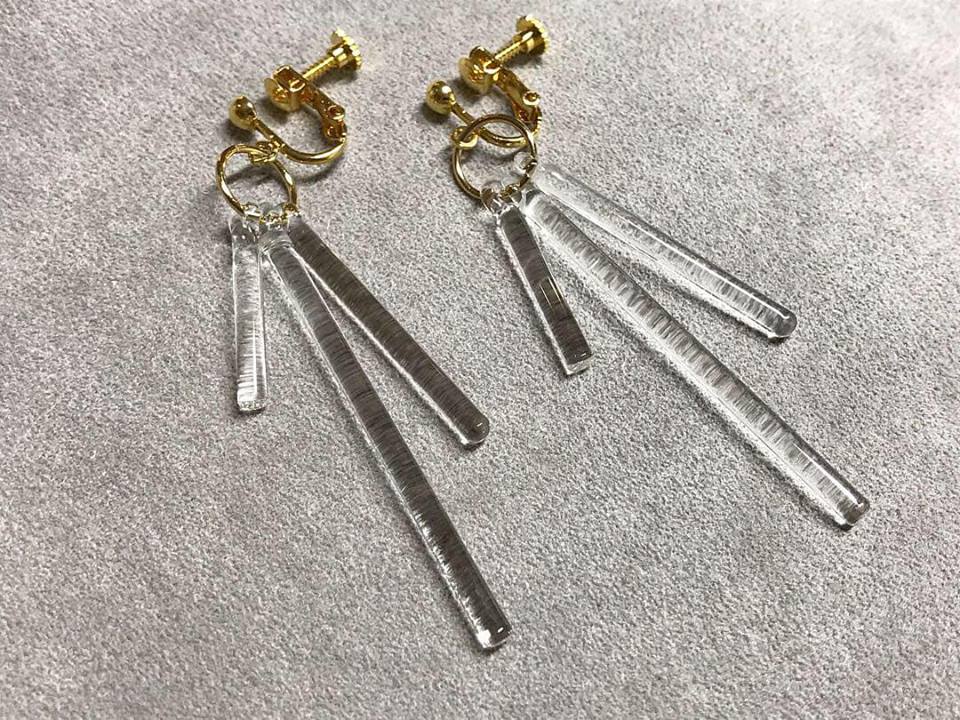 3本のガラスロッドが煌めく様が美しい。その魅力は、幾何学的なデザインがどこか都会的なムードを醸し出しているからかもしれません。単品ではもちろん、「ネックレス カナデ」とセットでお使い頂くと、よりいっそう統一感が出ますよ。