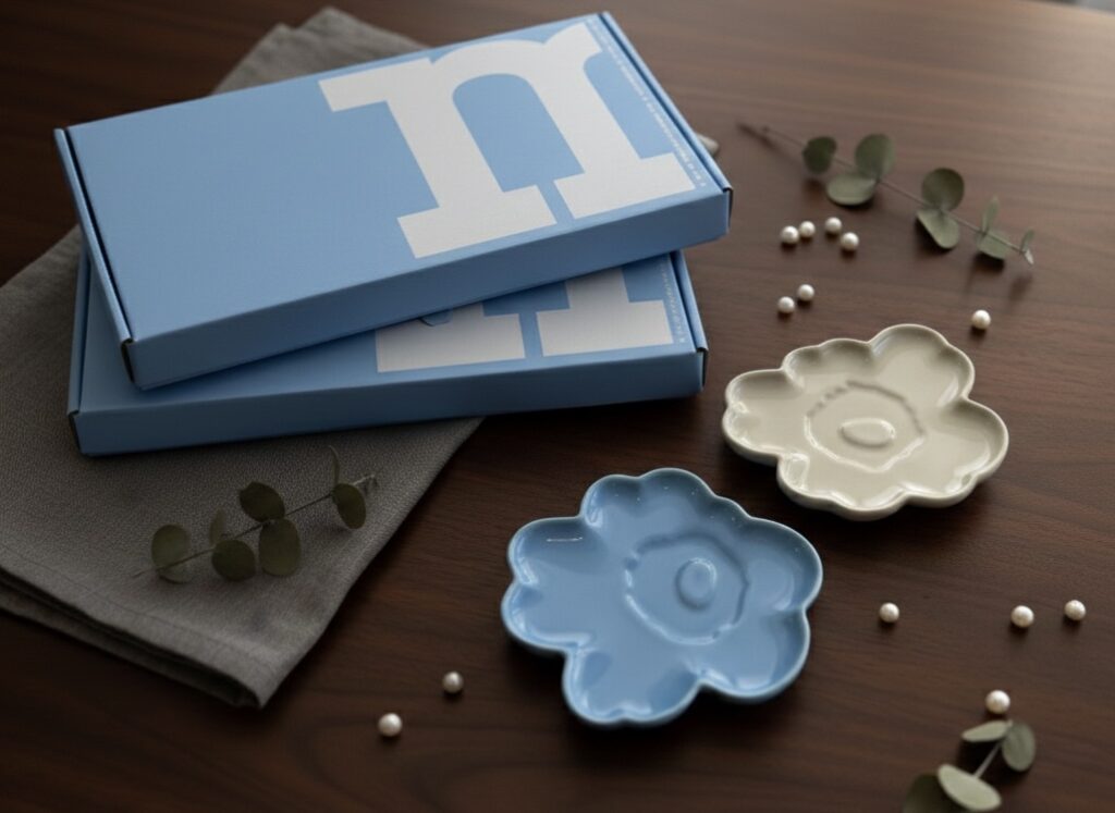 花瓶は手洗いをお勧めします。セットはマリメッコのギフトボックスに梱包されています。